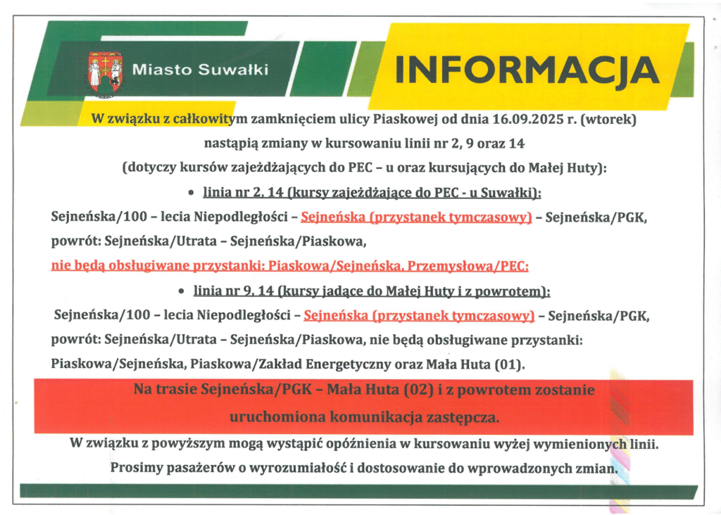 Gmina Suwałki uprzejmie informuje, że w miejscowościach: Stary Folwark, Leszczewek, Leszczewo, Cimochowizna, Tartak, Piertanie w dniach od 15.09.2025 r. do 22.09.2025 r. w godzinach 15.00-20.00 będą odczytywane wodomierze. Prosimy mieszkańców wsi o udostępnienie w powyższym terminie dostępu do wodomierza lub spisanie i podanie wskazań licznika Inkasentowi (istnieje możliwość wywieszenia karteczki z odczytem w widocznym i dostępnym miejscu lub podanie odczytu tel. 667-676-787). W przypadku braku możliwości odczytu, zostanie wystawiony rachunek według średniego zużycia.