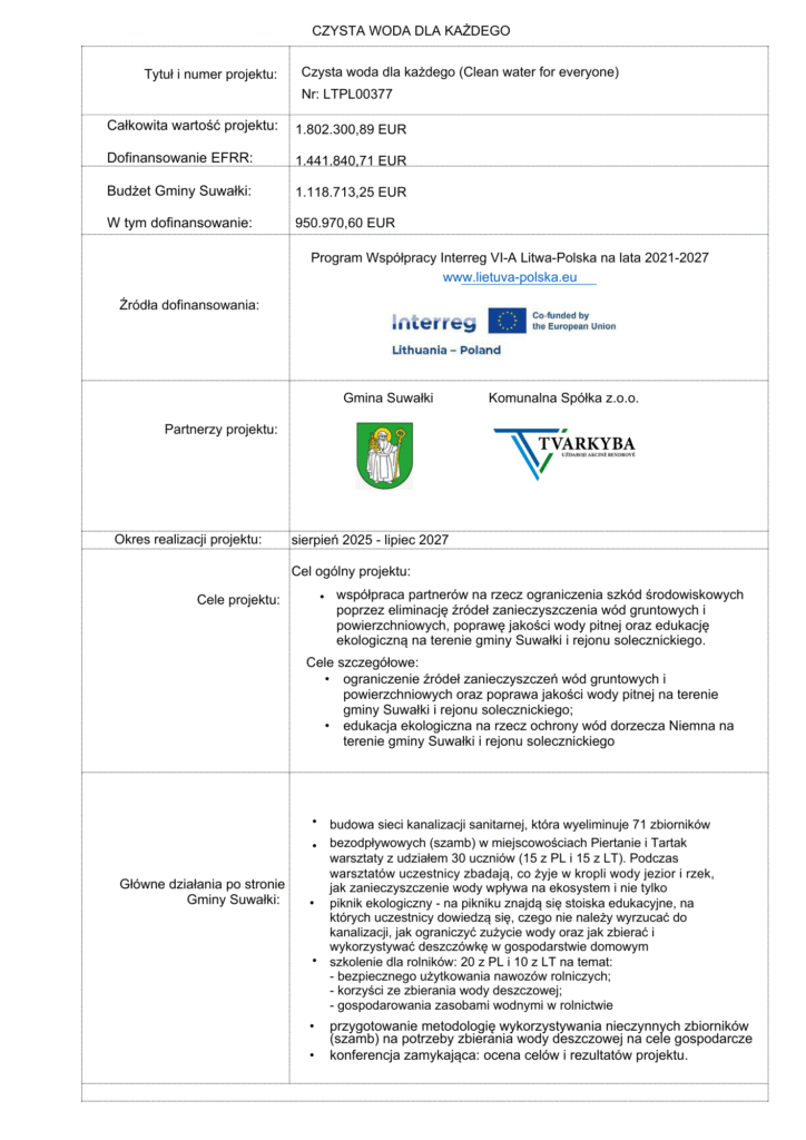 23 września 2025 r. w Urzędzie Gminy Suwałki odbyło się spotkanie partnerów projektu LTPL00377 „Czysta woda dla każdego”. Projekt współfinasowany jest w ramach Programu Współpracy Transgranicznej Interreg VI-A Litwa-Polska 2021-2027, www.lietuva-polska.eu