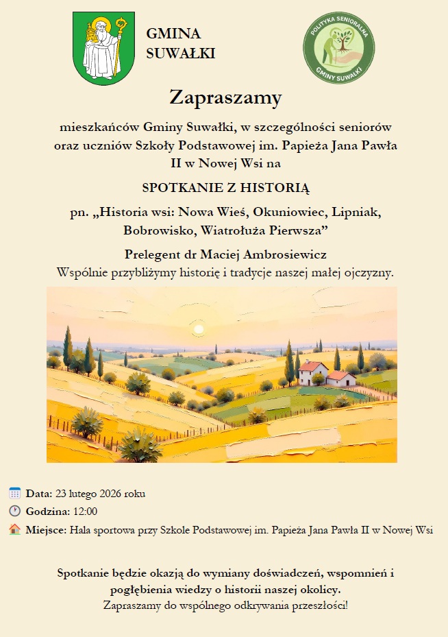 Mamy ogromną przyjemność zaprosić Was na wyjątkowe spotkanie, które pozwoli na wspólne odkrywanie historii naszej małej ojczyzny. W dniu 23 lutego 2026 roku, o godzinie 12:00, w Hali sportowej przy Szkole Podstawowej im. Papieża Jana Pawła II w Nowej Wsi odbędzie się interesujące wydarzenie – Spotkanie z Historią.